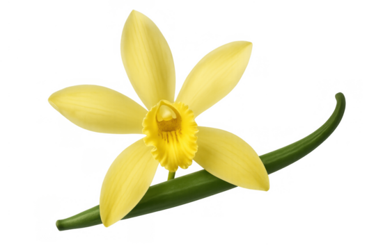 Vanilla orchid flower bloom and aromatic spice pod, natural yellow bloom with green bean, transparent background