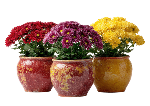 Three potted chrysanthemum plants in terracotta pots.  Vibrant red, purple, and yellow blooms