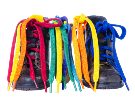 Two pairs of brown boots with vibrant rainbow colored laces, against a black background