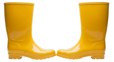 A pair of bright yellow rubber rain boots for rainy weather, autumn concepts, fashion, and gardening, isolated on white and transparent background