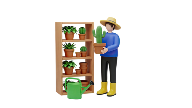 Gardener with Potted Cactus and Plant Shelf