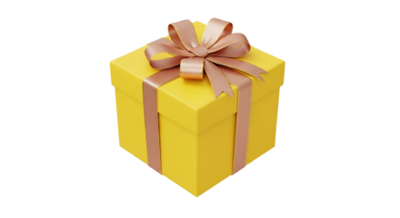 3d illustration of yellow gift box with rose gold ribbon and bow on transparent background