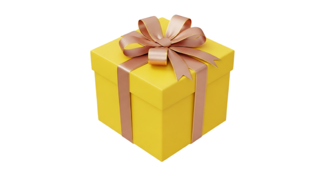 Gift box with yellow and green color scheme, featuring a brown satin ribbon and bow, ready for special occasions. Transparent background
