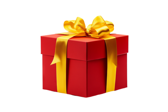 Red gift box with yellow bow and ribbons in top view on transparent PNG background, ideal for holiday celebrations and gift-giving designs