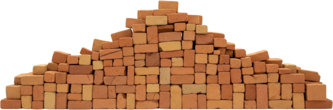 Stacked pile of diverse red and yellow clay bricks construction materials granular texture transparent background