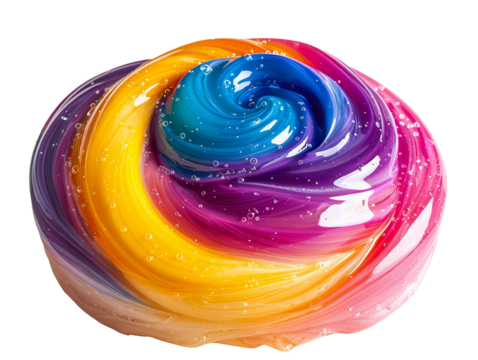 Colorful swirl of glossy, shiny slime with vibrant blue, purple, yellow hues and small bubbles. Abstract, toy, or texture background.