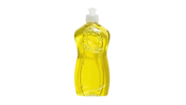 Isolated bottle of dish soap for the kitchen, yellow detergent for washing dishes, liquid gel
