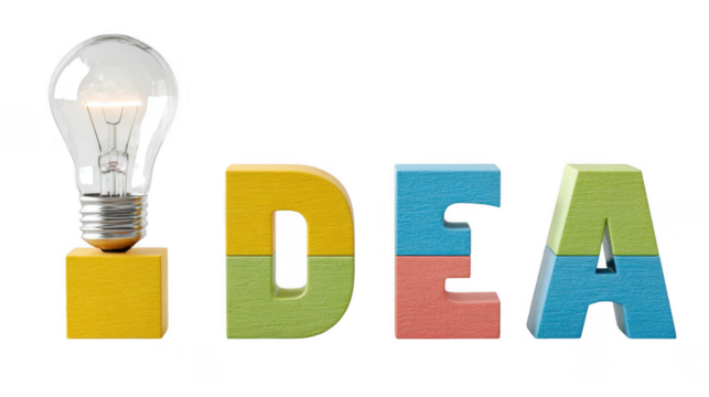 Lit light bulb standing on yellow building block next to colorful toy blocks spelling idea on a transparent background, representing creativity, innovation, and problem solving