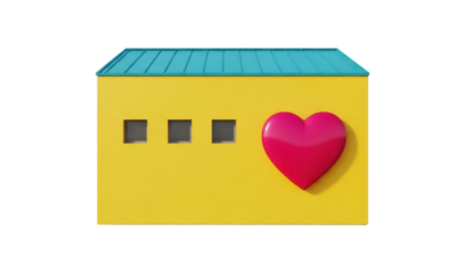 Isolated yellow building with blue roof and pink heart for love, safety, and kindness