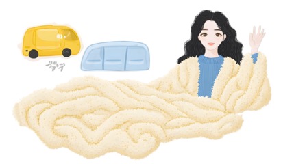 Cute Girl Illustration with Yellow Bus and Blue Van, Pastel Colors, Cartoon Style, Fashion Illustration, Transparent Background
