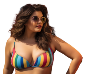 PNG Chubby Latina woman in a swimming costume standing in front of a colorful wall sunglasses swimwear portrait.