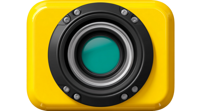 A yellow camera with a black lens isolated on transparent background