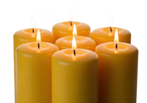Burning yellow candles group isolated on transparent background