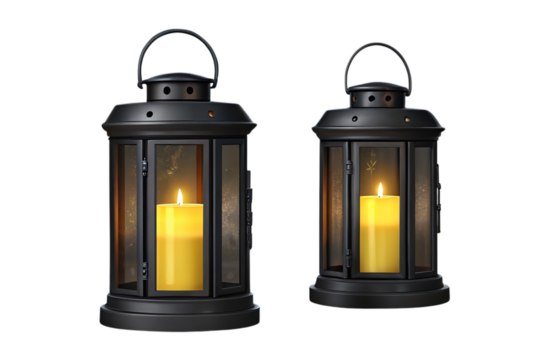Two black lanterns with yellow candles inside casting a warm glow on a black background scene