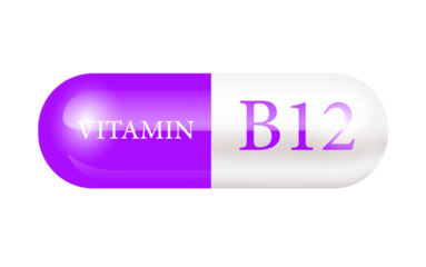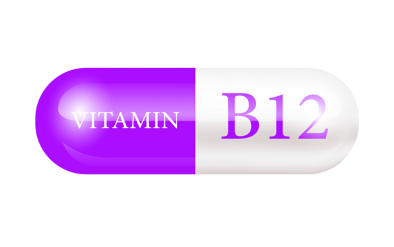 Capsule vitamin B12 (Thiamine) isolated on Cut out PNG. Structure purple, white. Vitamin complex with chemical formula. Drug business concept. Personal care, beauty. transparent pill.