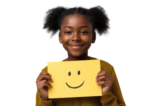 young girl holding yellow card with smiley face drawn on it isolated on white background
