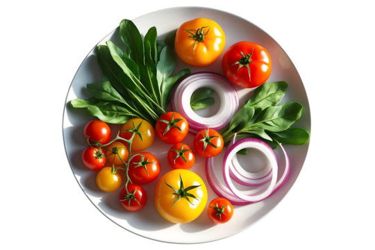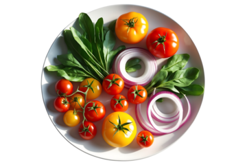 A fresh green salad with ripe red and yellow cherry tomatoes is served in a clear plastic bowl with a domeshaped lid, isolated on transparent background