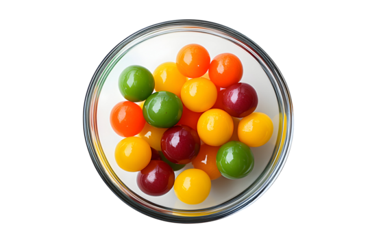 Bowl of freshly halved yellow cherry tomatoes isolated on transparent background