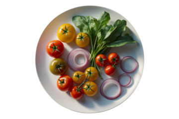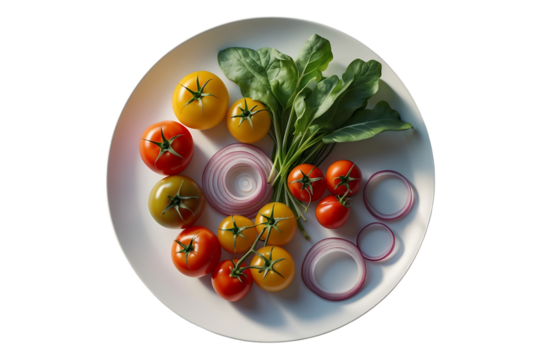 Fresh tomatoes, arugula, and red onion isolated on transparent background