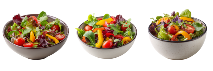 Three bowls of fresh mixed green salad with tomatoes and bell peppers isolated on a transparent background