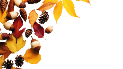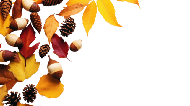A collection of autumn leaves, acorns, and small pumpkins arranged in a decorative frame on a transparent background. Ideal for seasonal designs.