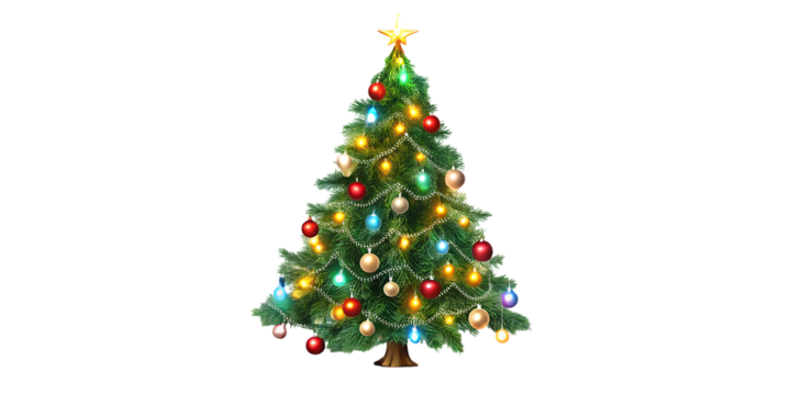 Decorated Christmas Tree with Star Lights on white background isolated on a transparent background