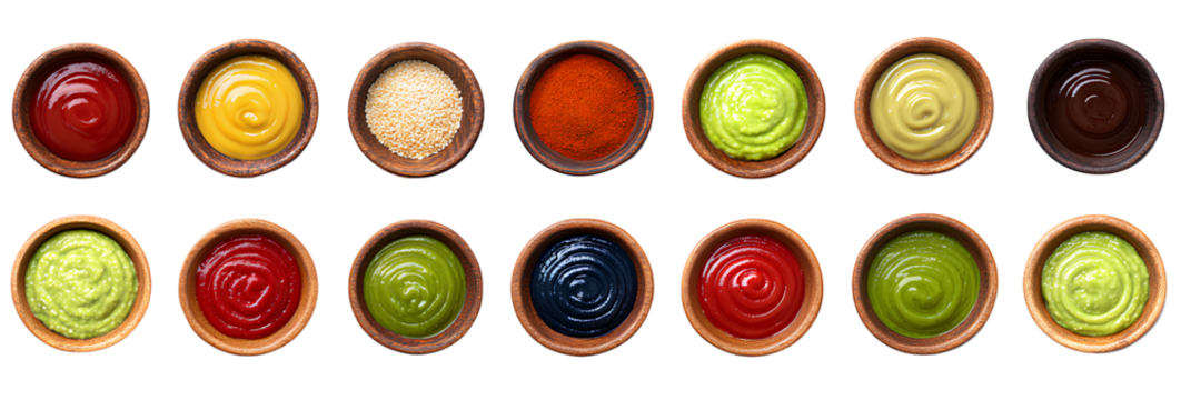 A collection of sauces and bowls on a Transparent background PNG