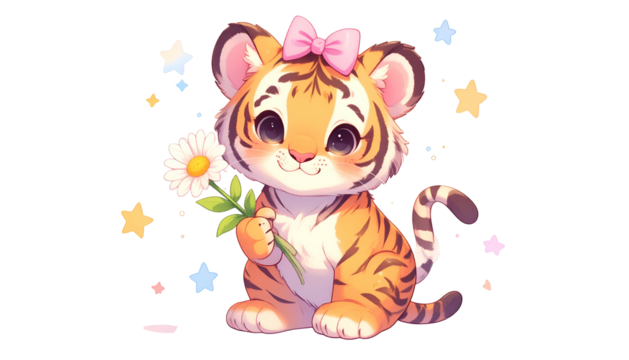 Adorable cartoon tiger cub with a daisy and pink bow, surrounded by colorful stars