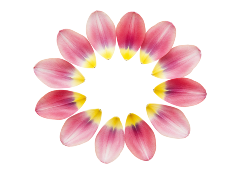 Delicate pink and yellow tulip petals arranged in a circular floral pattern isolated on transparent background