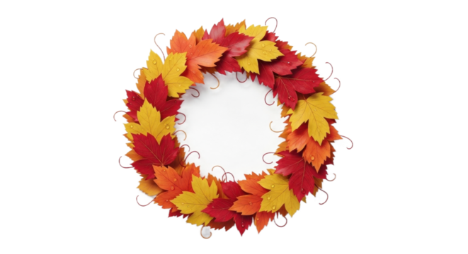 Autumnal leaf wreath, circular design, fall colors, decorative, crafted,  isolated on white background.