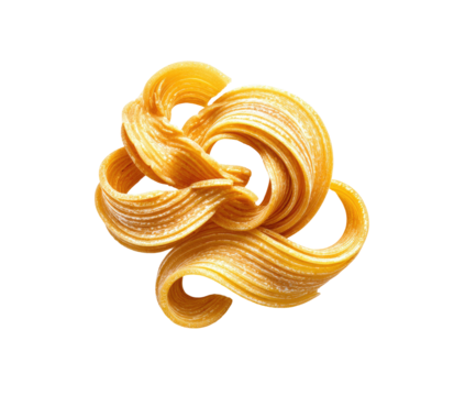 Close-up of a golden, twisted pasta, with ribbons swirling in a circular pattern