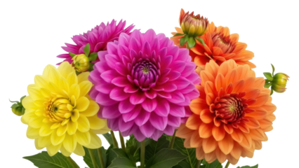 Colorful dahlia flowers isolated PNG on transparent background, vibrant floral arrangement for design projects and creative compositions