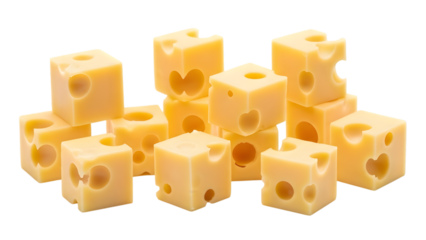 A small pile of irregularly shaped yellow cubes are clustered together in a central composition on a plain background isolated on white