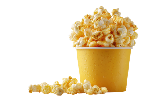 Overflowing yellow cup of fluffy, freshly popped popcorn, with scattered kernels at its base, set against a clean transparent background. background removed