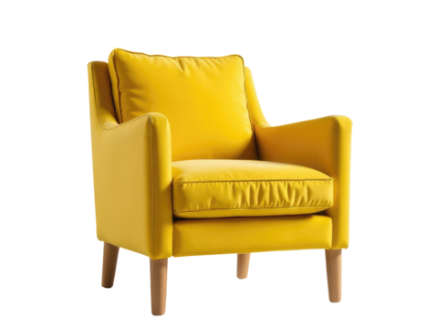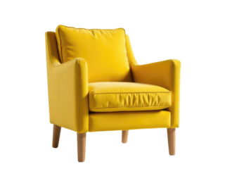 A yellow chair with wooden legs and a yellow cushion.transparent background
