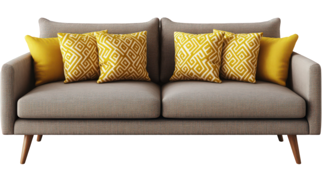 Comfortable green sofa with yellow cushions for stylish living space on a transparent background