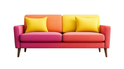 Stylish two-seater colorful couch with yellow cushions, cut out transparent
