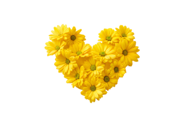 A heart-shaped arrangement of bright yellow daisies, bursting with energy and joy, creating a warm, cheerful representation of happiness, isolated on a transparent background