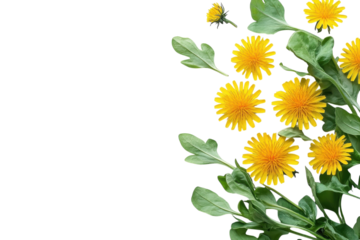 Field of yellow dandelion flowers with green leaves isolated. Flower border of yellow dandelions.