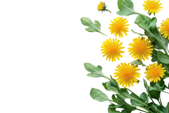 Group of dandelion plants with yellow flowers isolated cutout on transparent