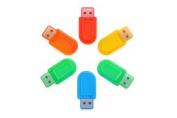Colorful usb flash drives forming a circle, representing data sharing, memory, digital communication, and secure storage on transparent background