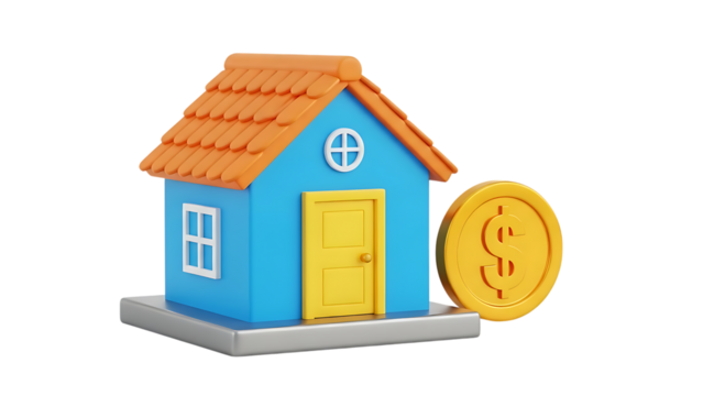 3D Cartoon Bank Building with Dollar Sign and Green Spheres
