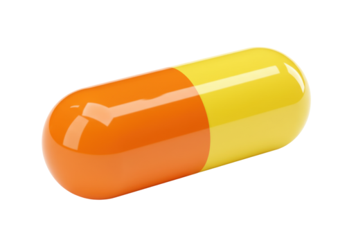Orange and yellow capsule isolated PNG, medicine pill on transparent background for healthcare and pharmaceutical use
