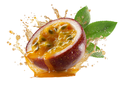 Passion fruit splash with juice and leaves isolated on a transparent background