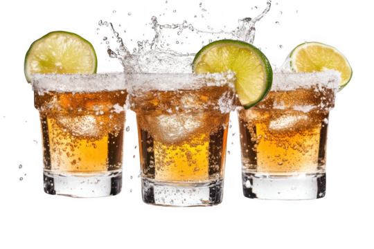 Three tequila shots with lime and salt splashing, isolated on transparent background