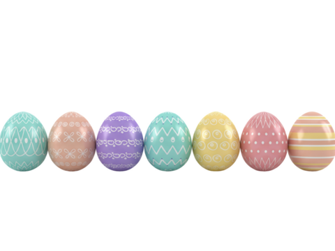 Three decorated easter eggs with floral and spotted designs on transparent background