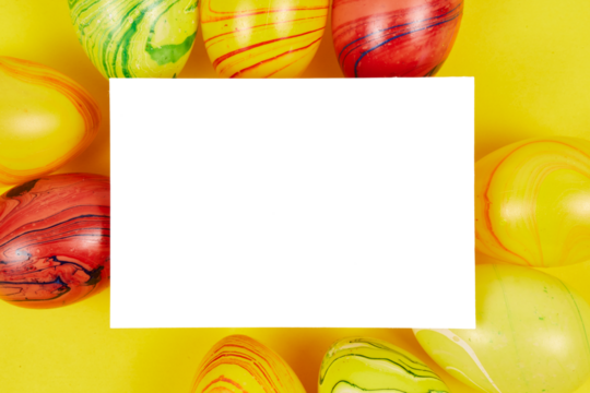 yellow happy easter card frame with colored easter egg and blank white copy space wish card isolated on white or transparent png