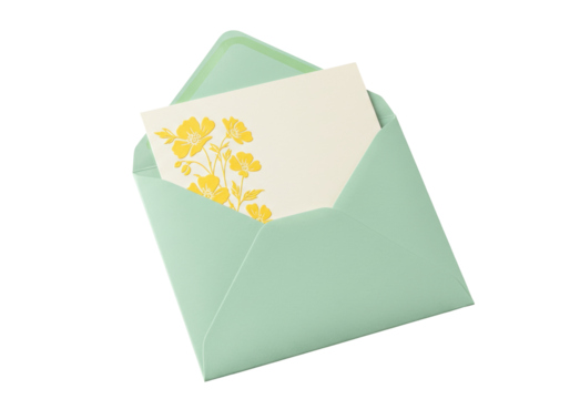 Isolated open pastel green envelope with yellow flower card for greetings or celebration
