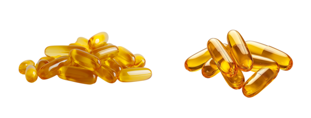 Pile of multiple yellow fish oil softgels isolated on a transparent background