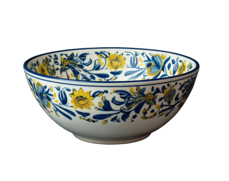 Square blue and yellow decorative plate PNG isolated on transparent background, vintage floral pattern dish for food presentation and table setting